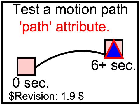 An animation moves a triangle along a path. Reference rectangles, lines and text are provided to help show what the correct behavior is. The red text shows the way that the motion path is specified